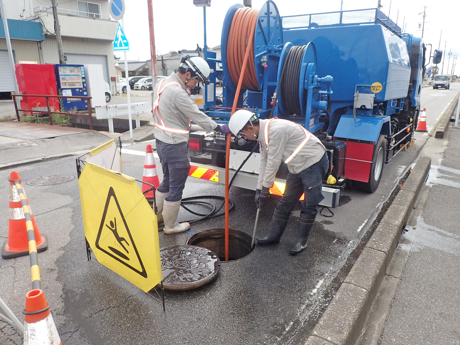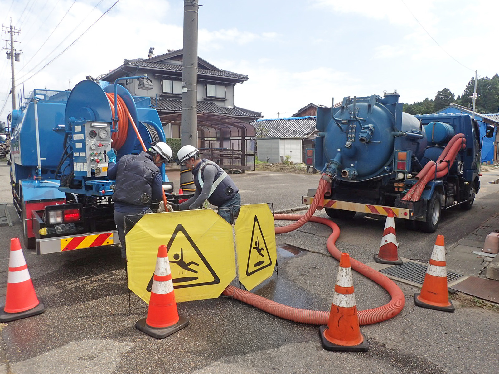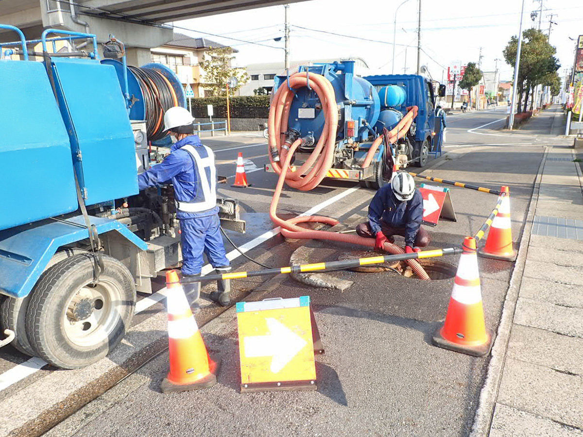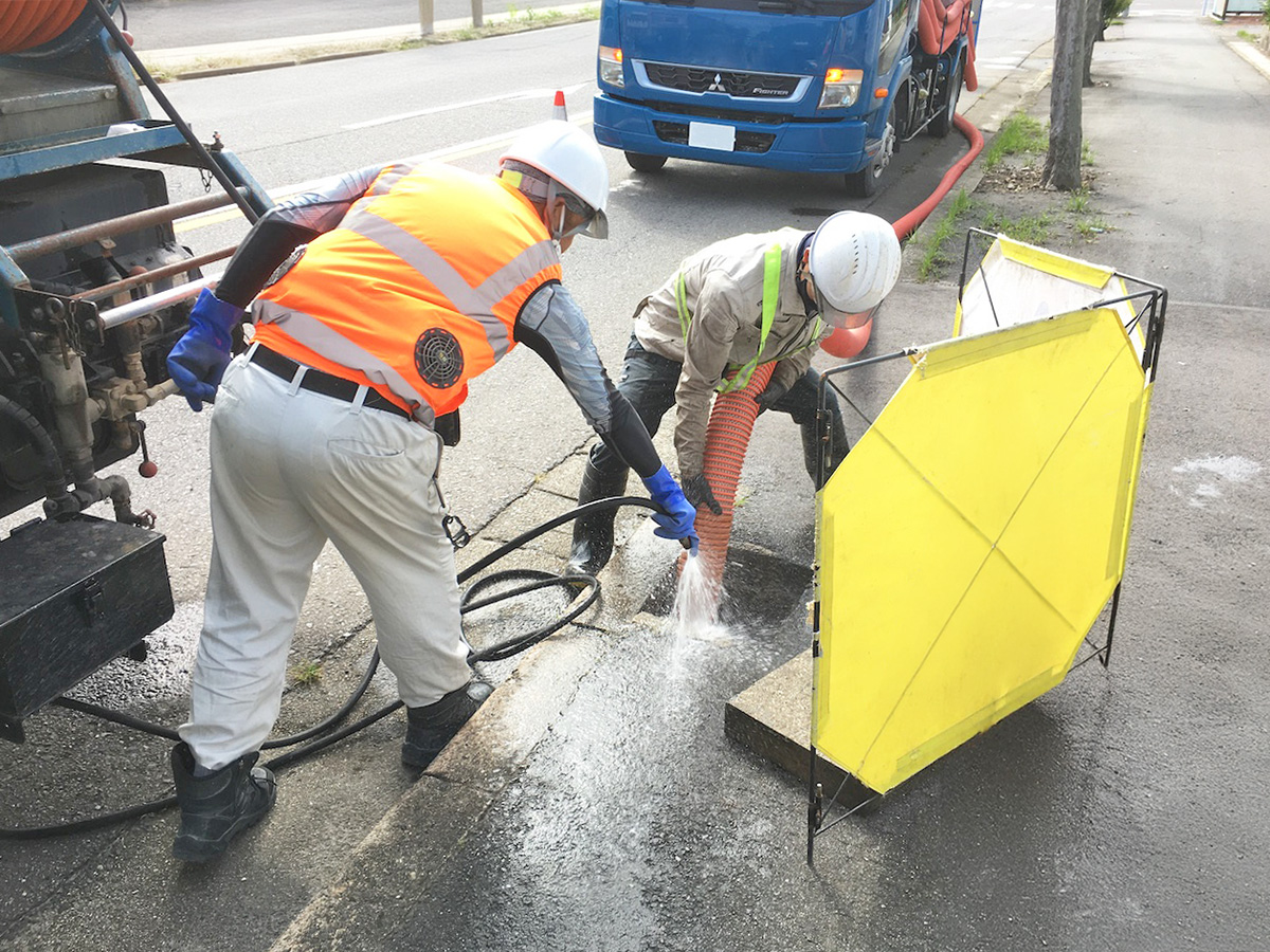 下水道管内に堆積物があると、水が流れにくくなるほか、硫化水素等の有害ガスの発生につながります。それらを予防するために、定期的に清掃することが必要です。高圧洗浄車と強力吸引車などを使って清掃し、流下機能の回復を図ります。また、これらの車両は河川や側溝の堆積土砂の掃除にも活用されます。