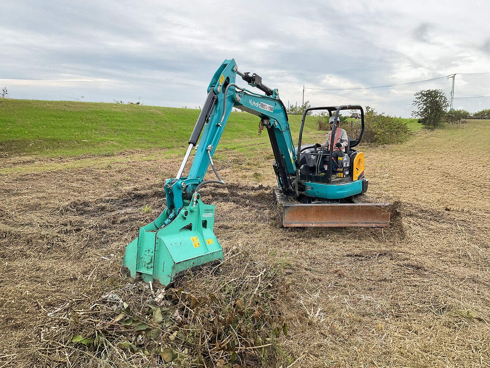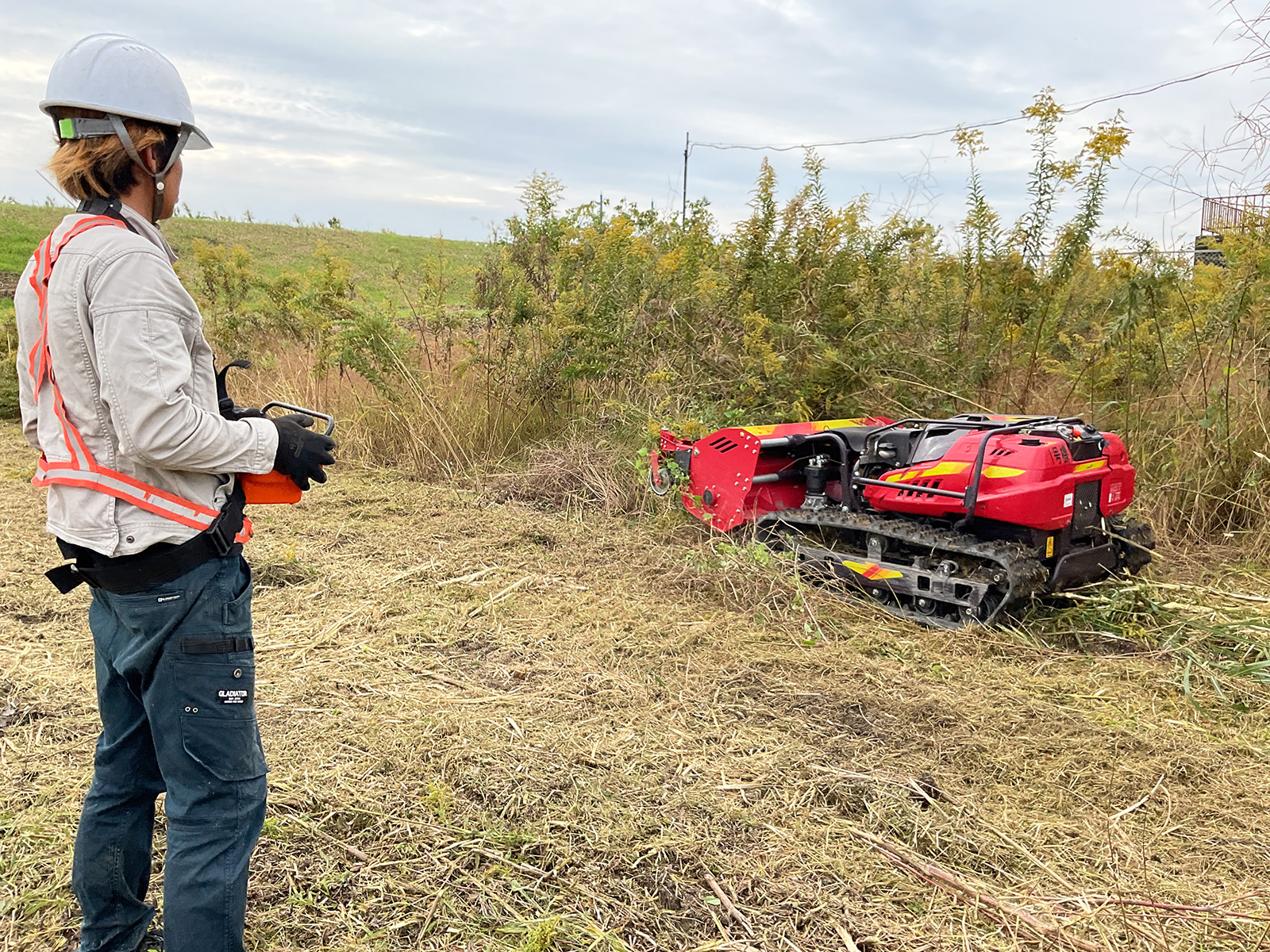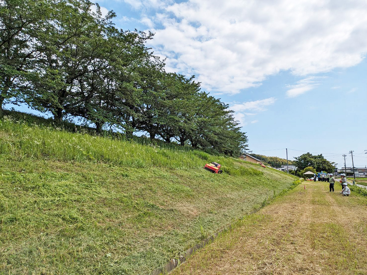 リモコン式草刈り機や重機による草刈りの様子